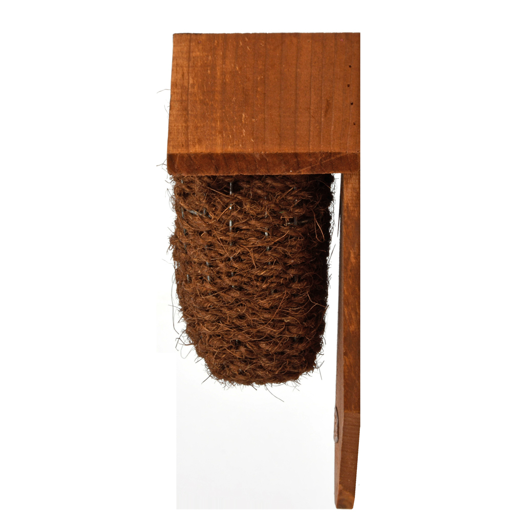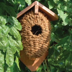 Der Beutel selbst besteht aus dunkelbraunem Kokosnussmark. Der Beutel ist an einer vertikalen Plattform mit Dach befestigt. Dieser ist aus FSC-zertifizierte Holz in Naturfarbe gefertigt. Solange es Grün im Garten gibt, macht sich der Nistbeutel hier gut. Das Dach sorgt dafür, dass das Nest schön trocken bleibt. Die Jungtauben werden sich bestimmt darüber freuen, denn der Beutel hat eine Einflugöffnung von 35 Millimetern. Das ist groß genug für kleine Vögel wie den Zaunkönig. ls.